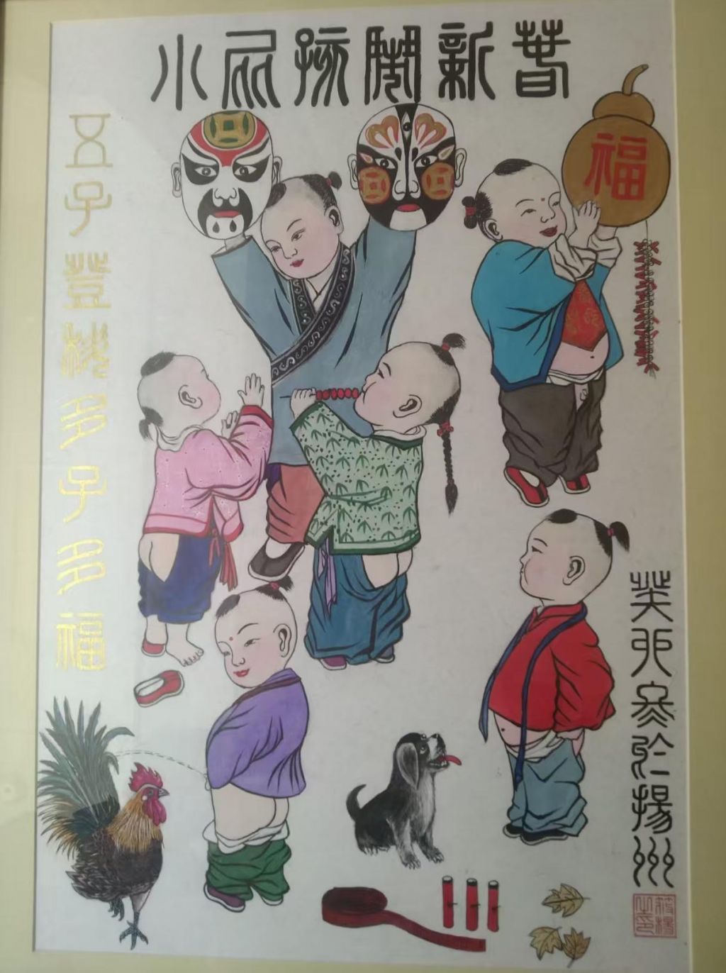在人物塑造上,筱杨老师的笔法细腻生动,孩童的五官简练但极具表现力,每个人的神情都各具特色,或笑逐颜开,或专注玩耍,或惊喜雀跃,充满童趣。其中,蓝衣男孩举着一只写有“福”字的葫芦,寓意福气满满,象征着对新年的美好祝愿,而两个手持戏曲脸谱的孩子,则为画面增添了传统文化的韵味,使整幅作品更具节庆仪式感。