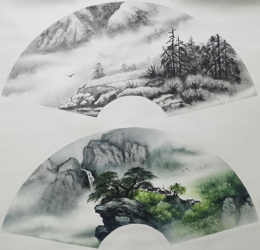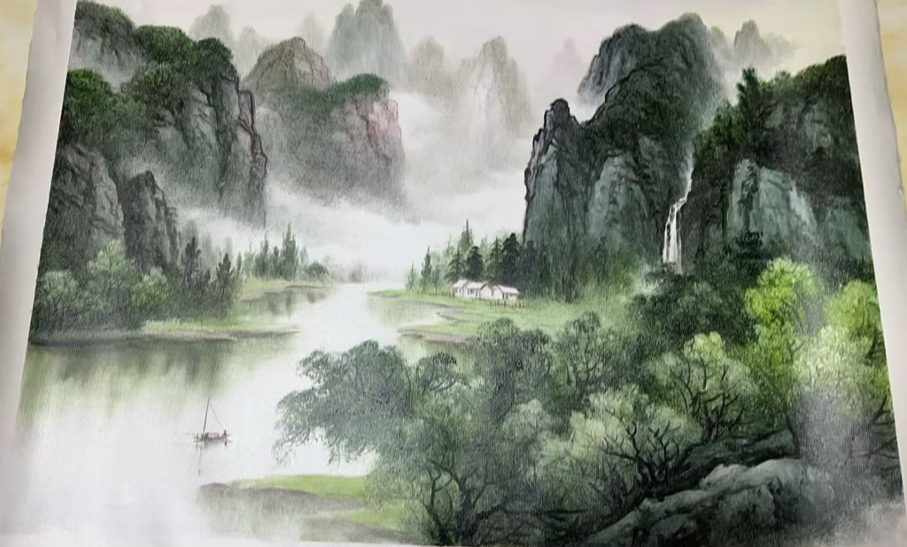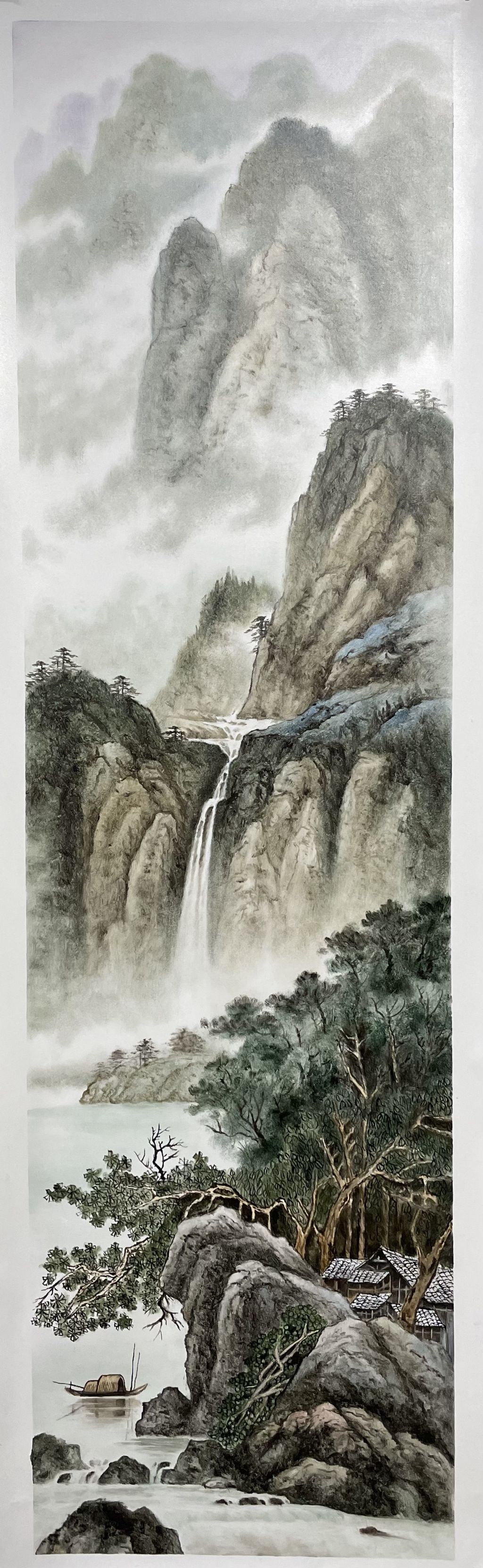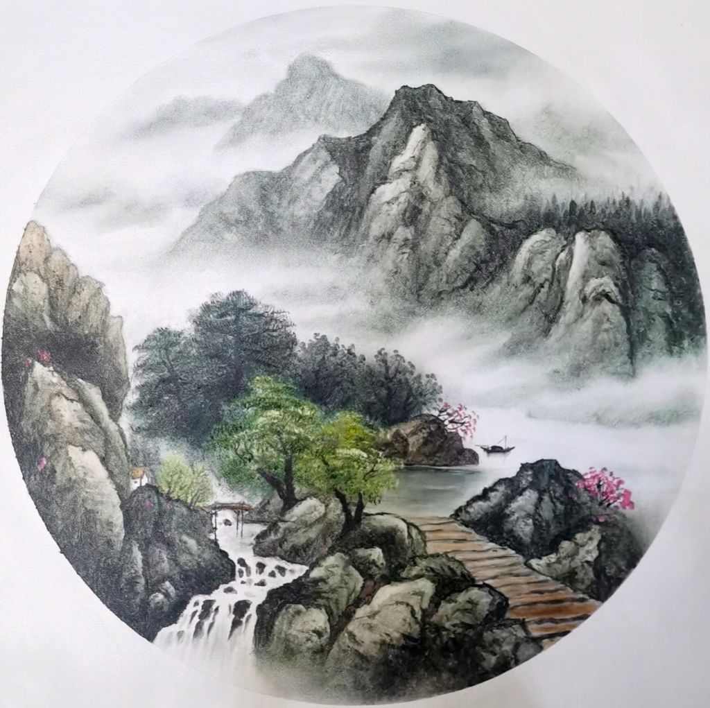 在色彩运用上,范老师展现了极为高超的技巧。整幅作品以青绿色调为主,辅以淡雅的灰白色,营造出烟雨氤氲的氛围。山体的石壁部分运用了冷灰色调,与周围的绿意形成对比,使山的质感更为突出,而云雾则采用柔和的笔法轻轻晕染,使远山在若隐若现之间更具层次感。近景的树木色彩较为浓郁,展现出生机勃勃的气息,而水面的光影变化,则通过微妙的渐变色彩表现得极其自然,既有宁静的倒影,又带有微微的水波流动感,使画面更加灵动鲜活。
