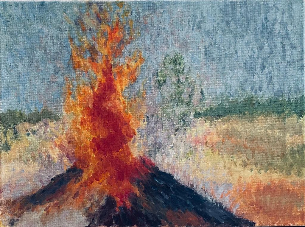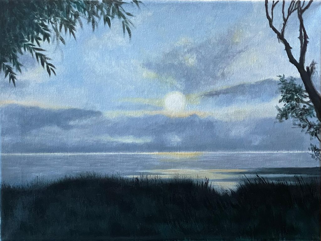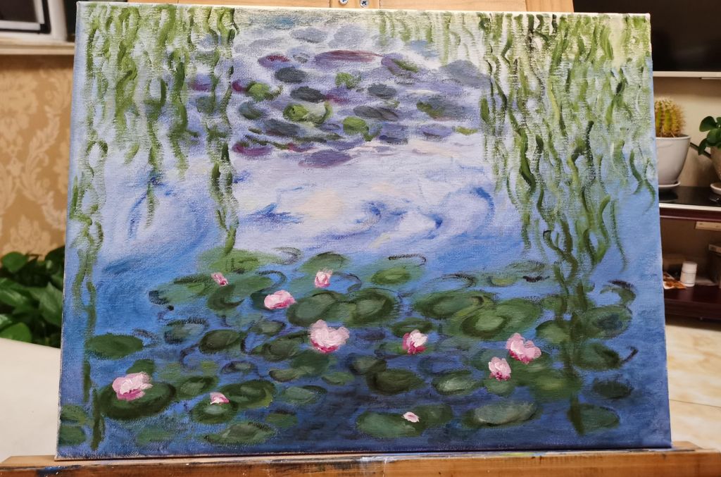 在技法表现方面,范老师展现出了油画技法的独特魅力。不同于传统油画的厚重肌理,本作的笔触处理更接近国画的层层晕染,尤其是在水面、云雾和山体过渡处,细腻的笔法让画面呈现出柔和而协调的层次感。同时,在树木的表现上,范老师采用了丰富的笔触变化,使枝叶的疏密关系清晰可见,并通过光影的渲染,展现了绿植的生动感。而岩石部分的纹理则运用了较硬朗的笔触,使其坚实感更加突出,表现出了山势的险峻与力量。