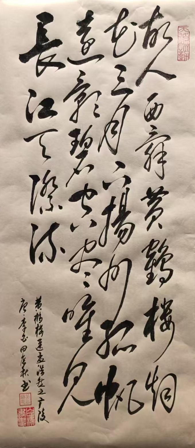 作品内容选择的是李白的名作《黄鹤楼送孟浩然之广陵》,这首诗抒发了诗人对友人离别的依依不舍之情,同时也表达了对广阔天地的向往和对人生旅途的洒脱心态。吴以道老师通过豪放的书法风格,将这种豪情表现得淋漓尽致,让观者不仅能感受到李白送别时的深情厚谊,还能感受到李白作为诗人的旷达情怀。