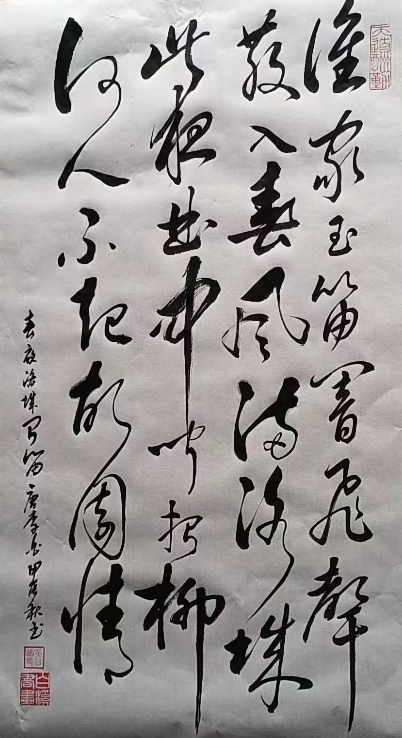 从整体来看,吴老师的作品气势连贯,一气呵成,展现了行草书特有的流动感和节奏感。作品中每一行的字都自成一体,但行与行之间又彼此呼应,形成了一种连贯的视觉效果,营造出一种“字如行云,笔似流水”的美感。字与字、行与行之间的空间布局极具匠心,既保持了疏密得当的美学,又赋予了整幅作品一种气韵流动的效果。这种巧妙的章法安排,不仅增强了作品的视觉美感,也使得诗句的意境更加悠远。