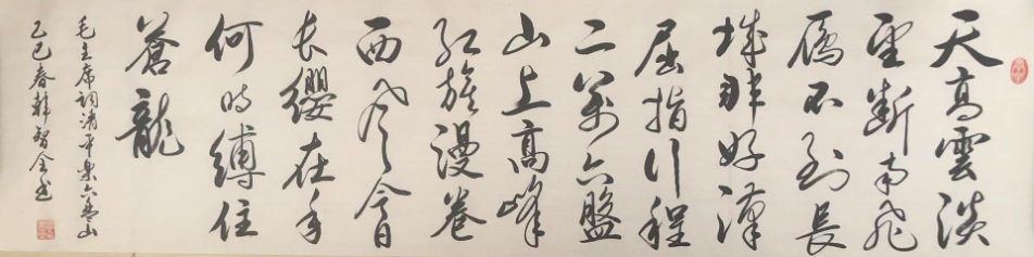 至于作品的情感表达,韩智全老师通过笔墨的变幻将毛泽东《清平乐·六盘山》中的豪情壮志与历史感展现得淋漓尽致。特别是在“今日长缨在手,何时缚住苍龙?”这句中,韩老师通过笔力的挥洒和字形的表现,传达了那种胸怀壮志、豪情万丈的情感。整个作品散发出一种昂扬向上的精神力量,仿佛能够感受到历史的脉动和时代的召唤。