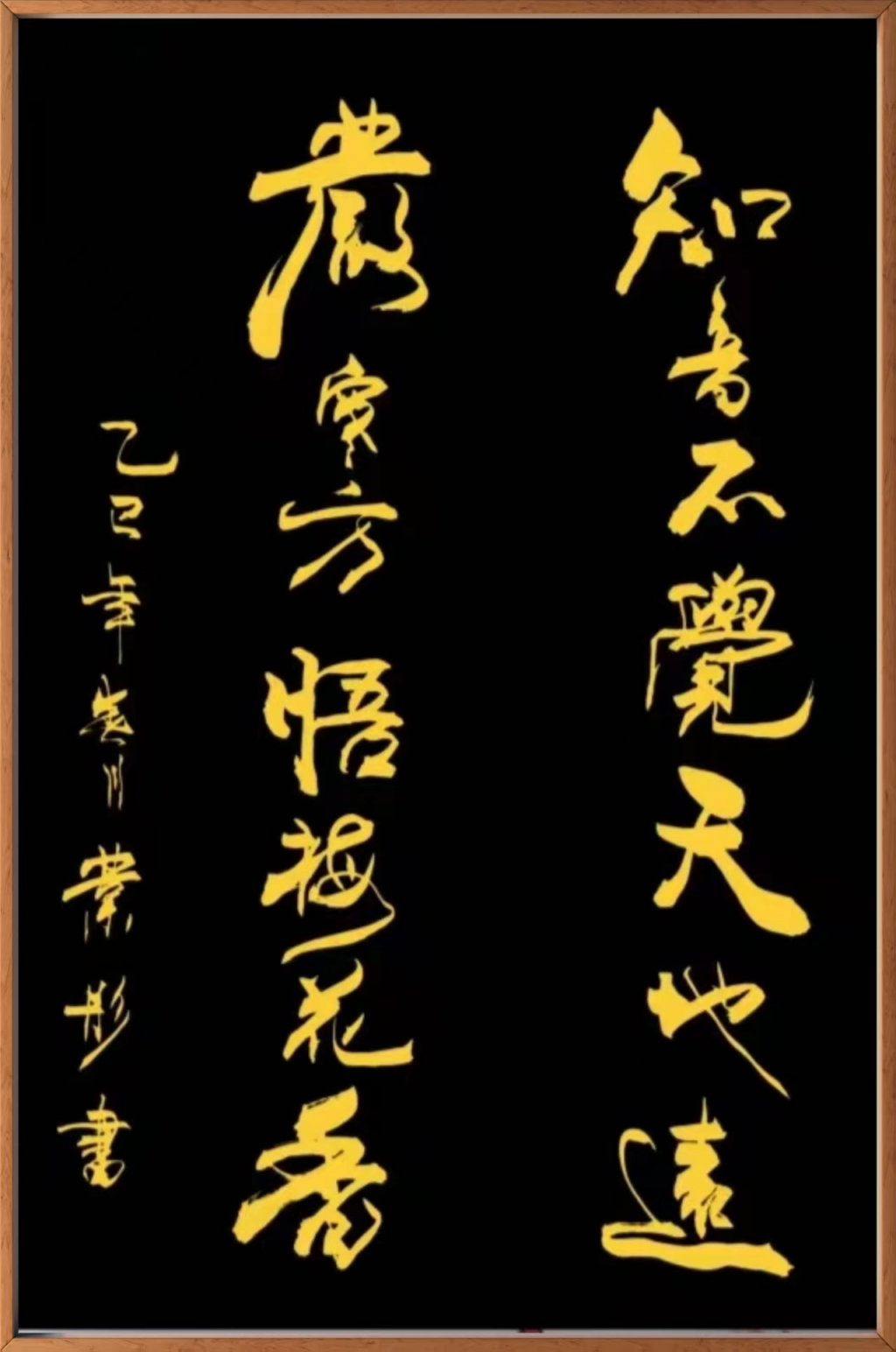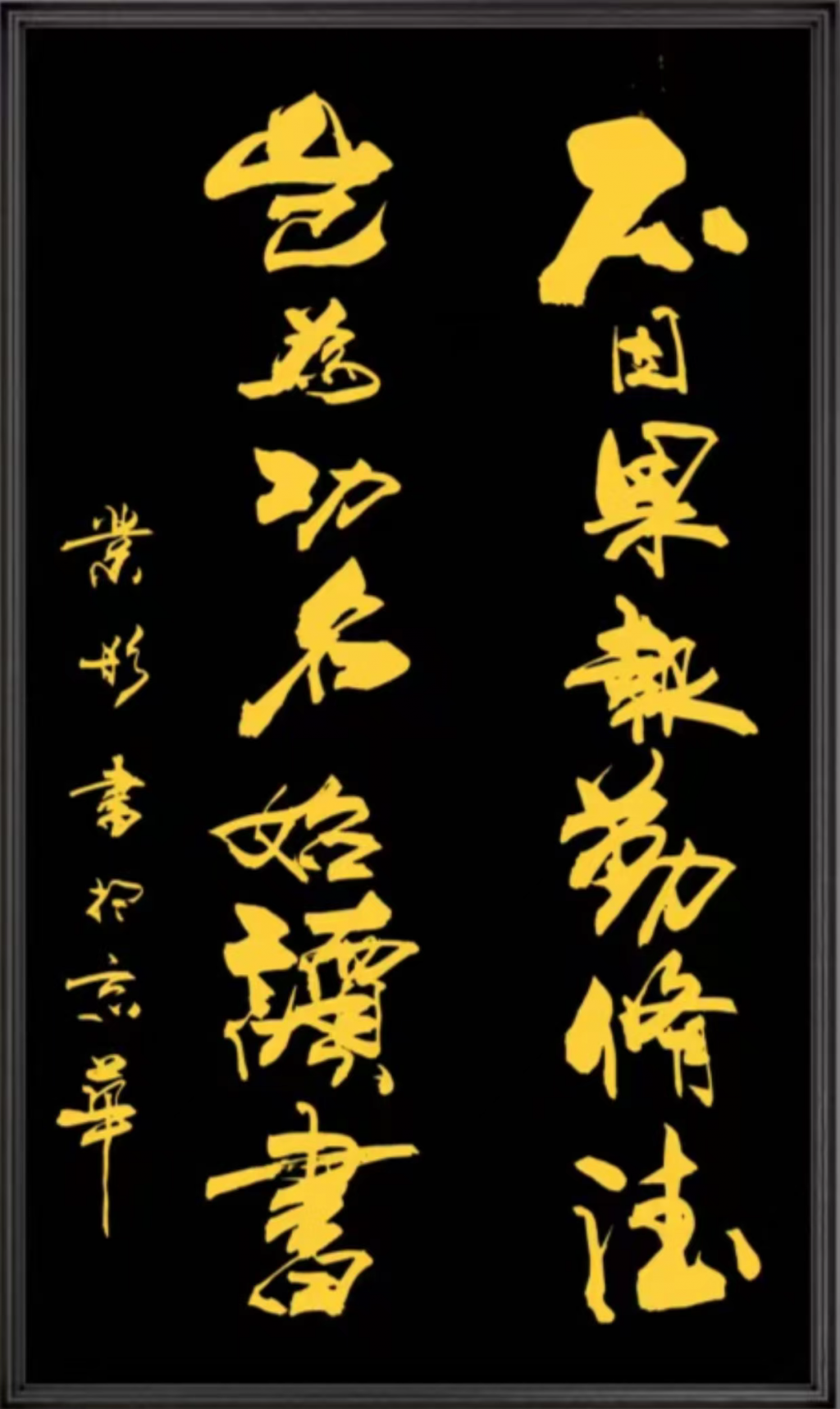 此外,墨色的运用也是本幅作品的一大亮点。金色的字体在黑色的背景下显得格外耀眼,这种配色不仅增强了作品的庄重感,也赋予了书法更加强烈的视觉冲击力,仿佛历史的厚重感扑面而来,令人感受到一种深远的文化意境。这种黑金搭配的形式,既具有传统书法的韵味,又富有现代艺术的表现力,极具创新意识。