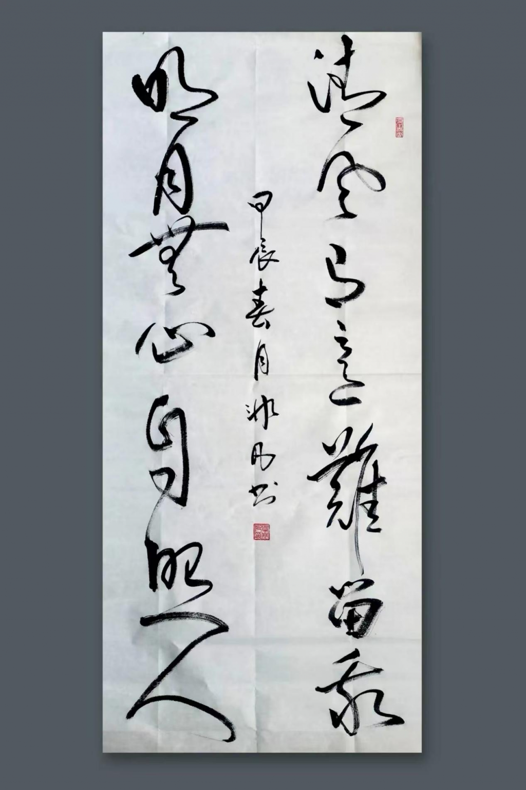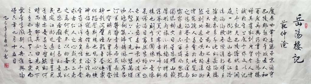 覃非凡老师的这幅《岳阳楼记》书法作品,整体呈现出雄浑壮丽的气势,字形端庄,笔力有力且稳重,展现了老师在书法技艺上的深厚功底和对文学作品内涵的理解。通过对范仲淹《岳阳楼记》这一经典古文的书写,覃非凡老师不仅传达了文章的历史背景和文化精神,也通过书法的形式赋予了这篇千年古文新的生命力。