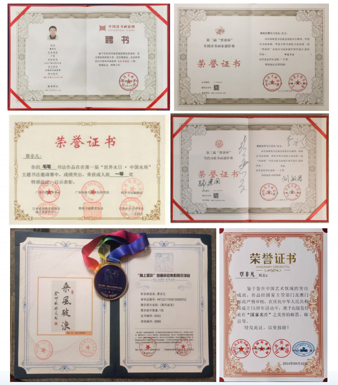 在漫长的艺术生涯中,覃非凡通过坚持不懈的自学研修,广泛涉猎历代书法经典,汲取传统书法的精髓。同时,他虚心师从前辈名家,在名家的悉心指导下不断修炼,书法技艺逐步提升,如今已日趋成熟。几十年来,他笔耕不辍,每日坚持练习,在楷书、行书、草书等多种书体上均达到了较高的艺术水准。其创作的多幅作品展现出独特的艺术风格与深厚的功底,被《东方名作典藏》等大型专著收录。不仅如此,覃非凡积极参与国际和国内各类书法比赛,屡获佳绩。他荣获世界华人艺术家成就奖,数次在中国诗书画家网书法赛事中斩获一等奖;在2024年亚细亚(韩国)美术展中荣获三等奖;在中国《书法报》举办的赛事中获得三等奖;还多次获得广西书法教育学会一等奖以及广西硬笔书法家协会优秀奖等不同级别的奖项。2024年9月,他创作的书法作品《乘风破浪》更是被国家游泳中心(水立方)烧制成艺术砖,装饰在中心大厅,彰显出极高的艺术价值。此外,有多幅他的书法作品得到国家和澳门邮政部门的认可,准予出版发行具有“国家名片”美誉的邮票、邮品,其作品影响力由此可见一斑。