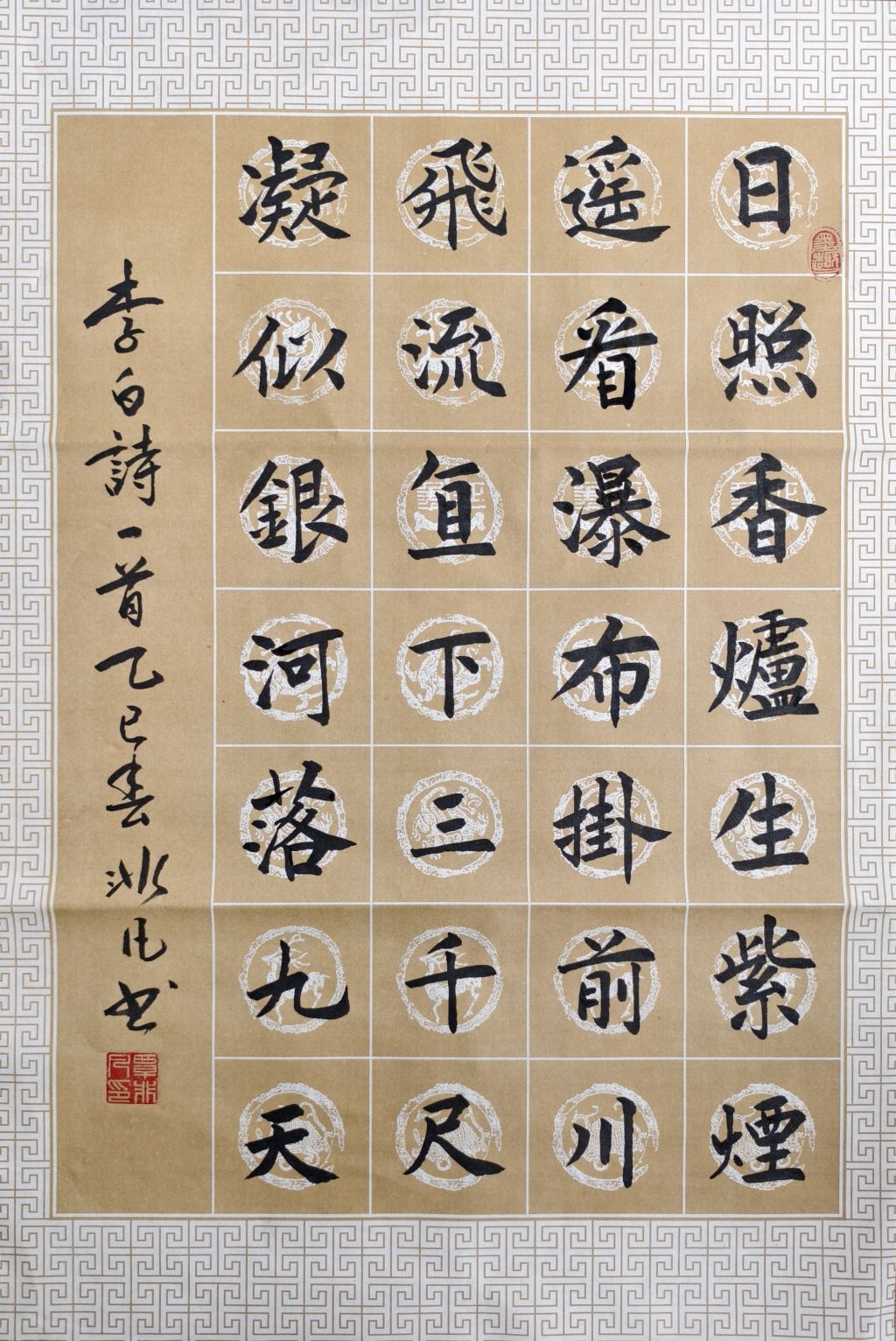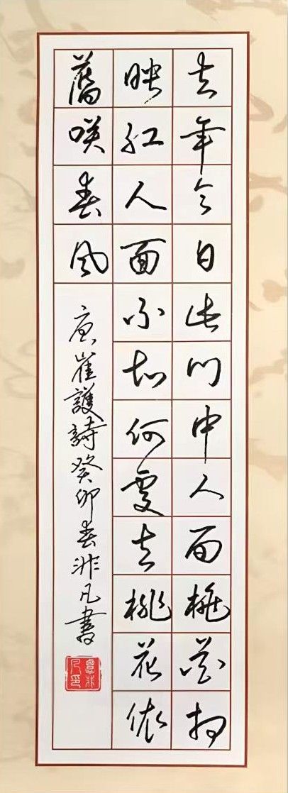 从整体布局来看,字与字之间的排列整齐,节奏感强烈,体现了书法的和谐与美感。每一行的字形大小一致,行与行之间的间隔恰到好处,营造了视觉上的流畅感与整体感。作品的横向布局充满了空间感,文字的疏密变化也形成了一定的呼吸感,使得整幅作品既不显拥挤,也不显空旷,展现了覃非凡老师在构图上的精妙。