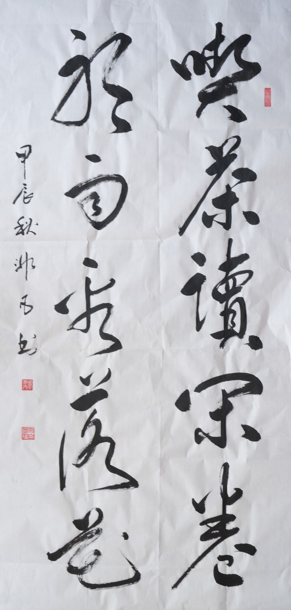 然而,作品仍有些细节可以进一步调整。比如,“记”字左半部分的左侧可以适当放宽笔画的力度,使得整幅作品的气势更为和谐。同时,在部分笔画的起伏变化上,可以再增强一些轻盈感和流动性,使字形的动感更强,进一步体现书法的韵律之美。