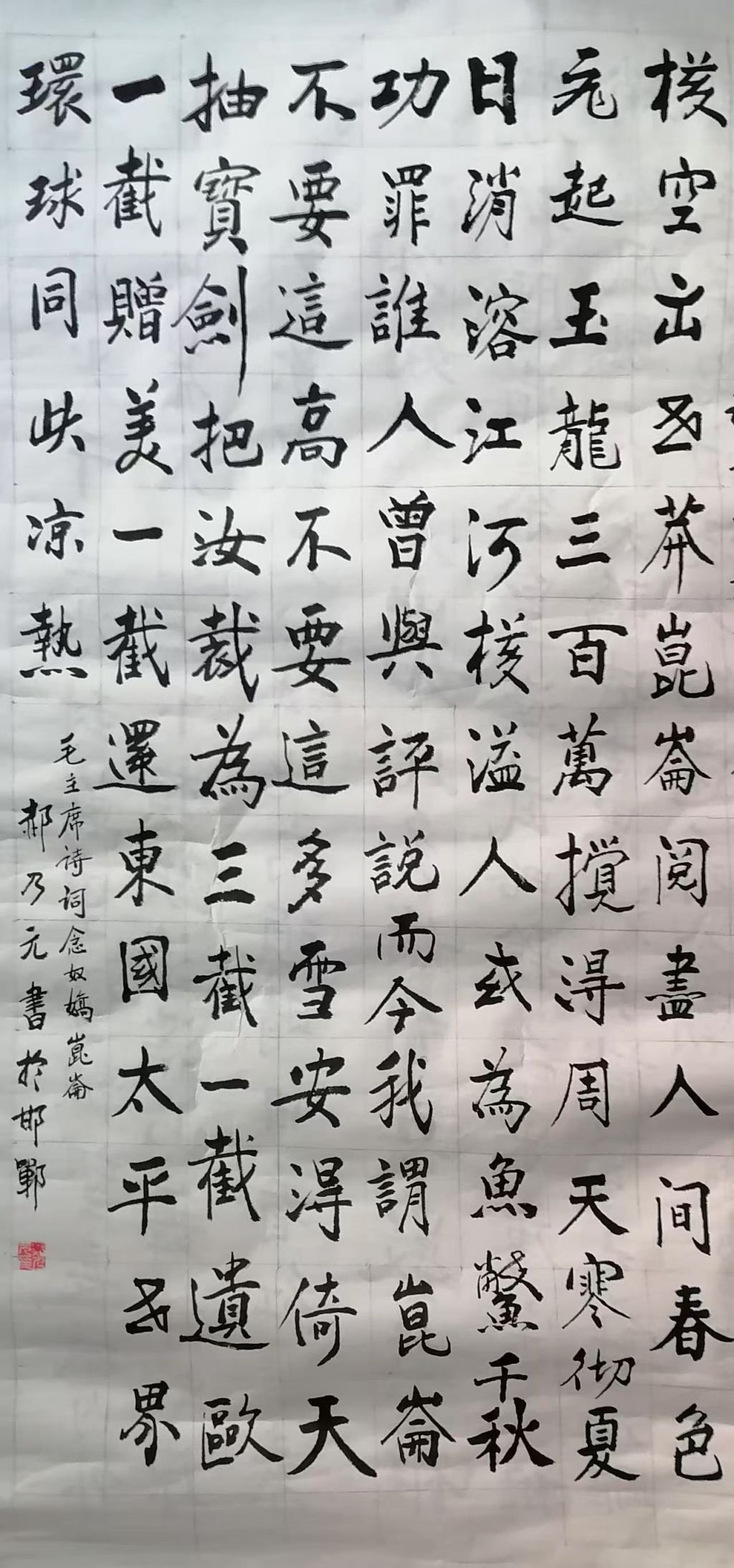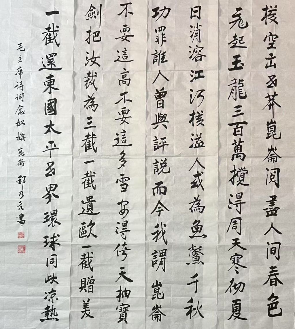 从整体观感来看,郝老师的书法风格刚健俊逸,既有端庄稳重之气,又不失灵动洒脱的韵味。通篇作品结构严谨,行气贯通,气势一气呵成,与《念奴娇》这首词的豪放风格相得益彰,极富感染力。字里行间透出的刚毅与磅礴之势,仿佛让人听见江河奔流,感受到革命年代的激情澎湃。
