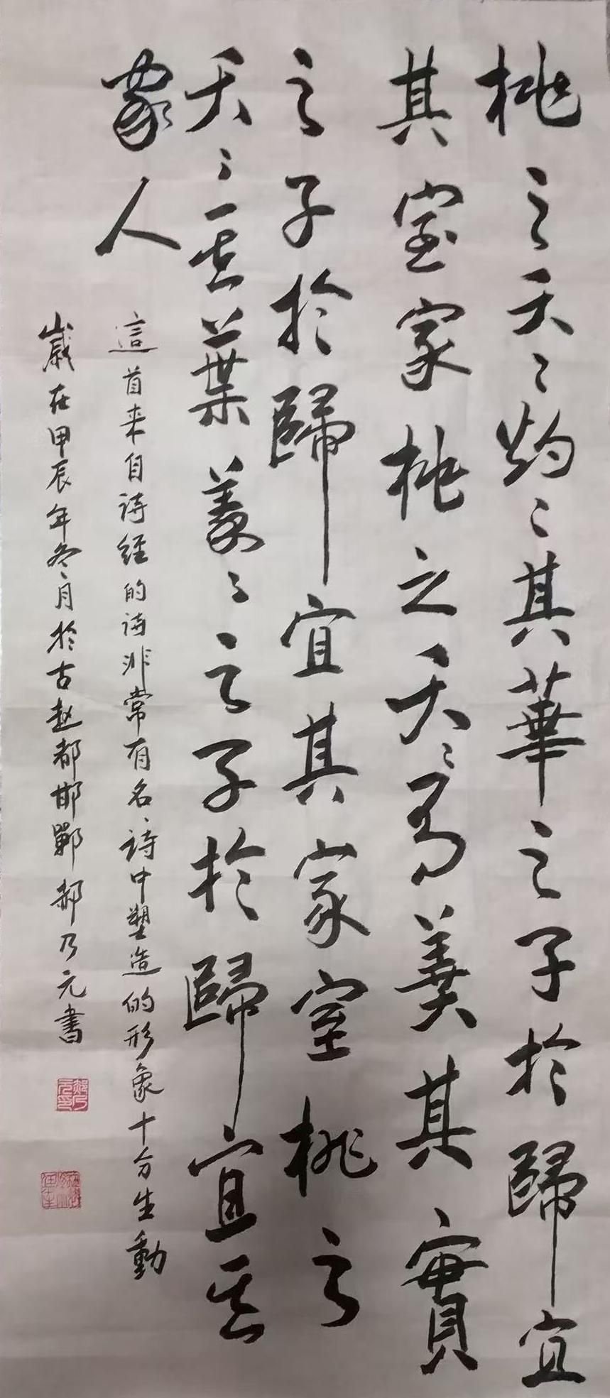 从字形来看,作品中每一字的结构都经过精心安排,大小错落得当,形态各具特色。字的重心把控精准,笔画间的留白恰到好处,既保证了整齐美观,又增添了书法的韵律感。在横画与竖画的交错布局中,展现了郝老师对字形的精准把握,使得每个字既能独立成章,又能在整体上相互呼应,增强了作品的整体协调性。